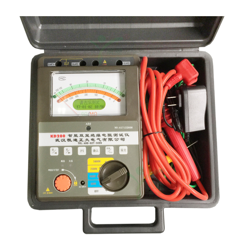 武漢凱迪正大電氣有限公司專業(yè)生產(chǎn)的KD200系列型智能雙顯絕緣電阻測試儀采用嵌入式工業(yè)單片機(jī)實時操作系統(tǒng),薄形張絲表頭與圖形點陣液晶顯示器較好結(jié)合,KD200系列表具有多種電壓輸出等級(500V、1000V、2500V、5000V)、容量大、抗干擾強(qiáng)、指針與數(shù)字同步顯示、交直流兩用、操作簡單、自動計算各種絕緣指標(biāo)(吸收比、極化指數(shù))、各種測量結(jié)果具有防掉電功能等特點。是測量大容量變壓器、互感器、發(fā)電機(jī)、高壓電動機(jī)、電力電容、電力電纜、避雷器等絕緣電阻的測試儀器。