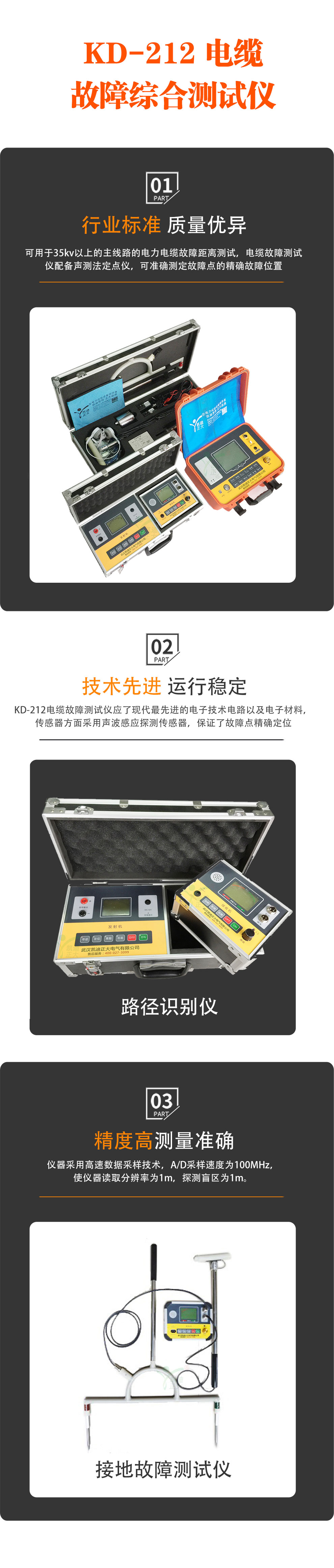 KD-212電纜故障測試儀是一套綜合性的電纜故障探測儀器。能對電纜的高阻閃絡(luò)故障,高低阻性的接地,短路和電纜的斷線,接觸不良等故障進(jìn)行測試,若配備聲測法定點(diǎn)儀,可準(zhǔn)確測定故障點(diǎn)的精確位置。特別適用于測試各種型號、不同等級電壓的電力電纜及通信電纜。