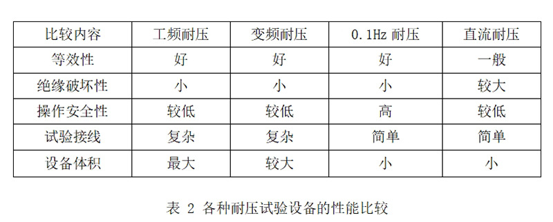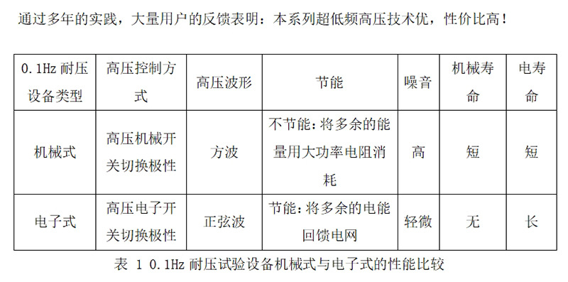 我公司新一代系列超低頻高壓發生器是采用自主研發的核心產品,采用 7 寸觸模屏、進口高速AD采集電路,以及新生產工藝。提高了儀器質量穩定性,降低了設備的體積和重量,操作簡單,克服了國內同類產品的諸多缺點(見表 1),性價比高于同類進口產品的機械式升壓器使用壽命短、故障率高、體積大的缺點。相較于其他幾種耐壓試驗設備方式而言,0.1Hz超低頻具有諸多優點,如表2。