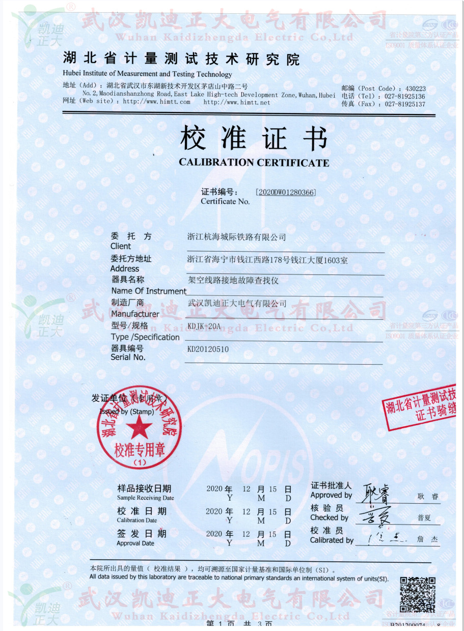 KDJK-20A架空線(xiàn)路接地故障查找儀獲得湖北計(jì)量院校準(zhǔn)證書(shū)