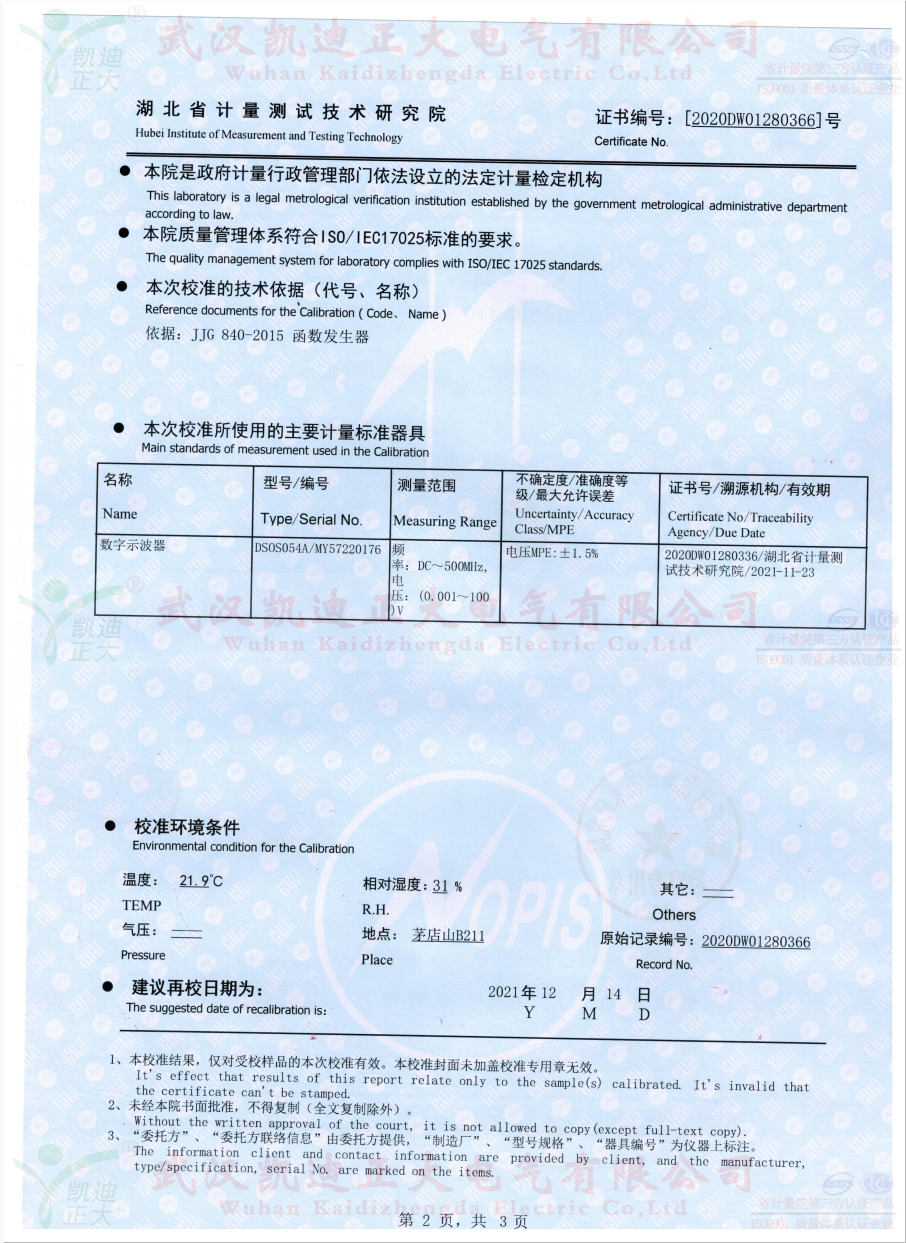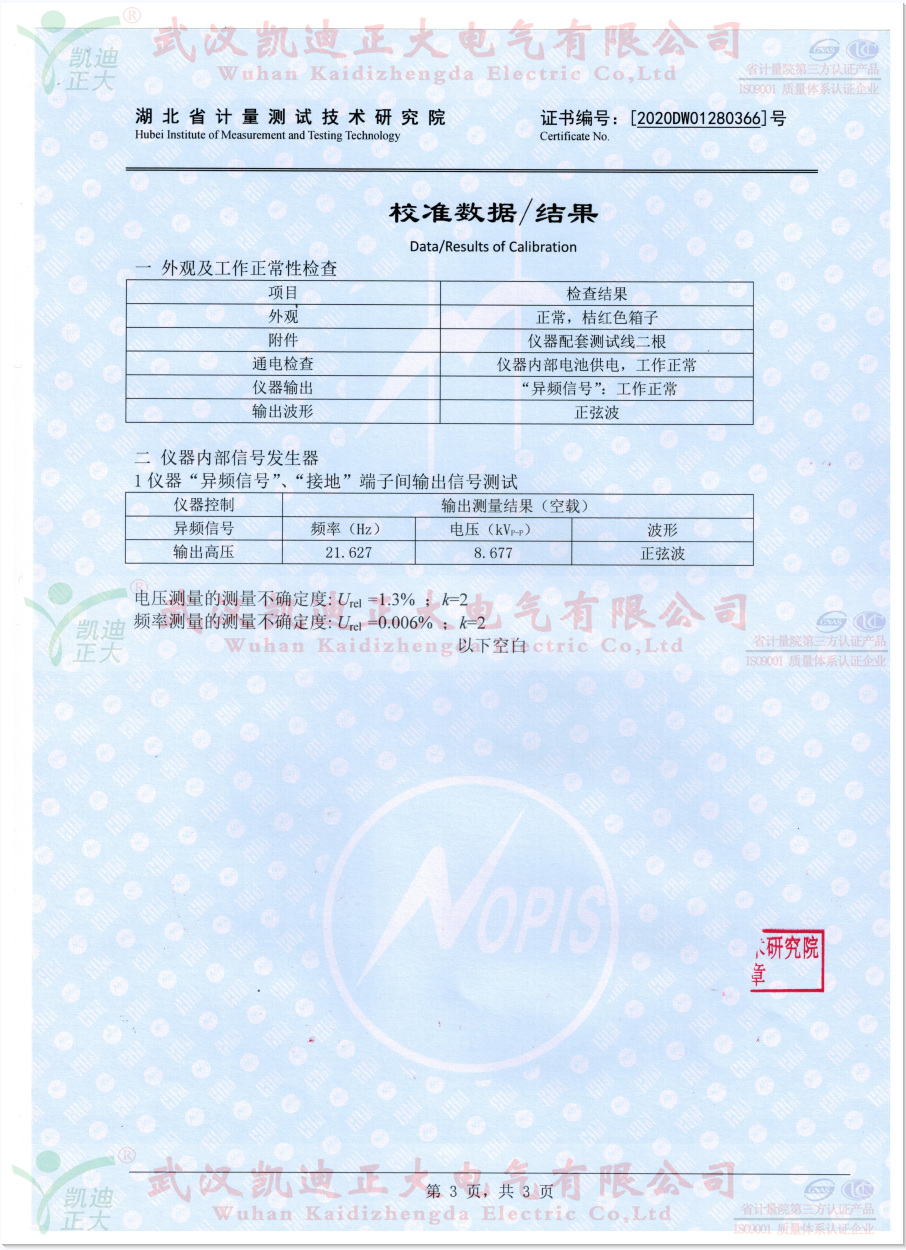 繼我司抽檢10套KDJK-10A配網(wǎng)單相接地故障定位儀送往湖北省計(jì)量測(cè)試技術(shù)研究院校準(zhǔn),此次獲得電學(xué)所檢測(cè)設(shè)備DS0S054A數(shù)字示波器標(biāo)準(zhǔn)設(shè)備的數(shù)據(jù):輸出波形正玄波、異頻信號(hào)21.627Hz、輸出電壓8.677kV、頻率測(cè)量的不確定度0.006%。符合武漢凱迪正大公司和國(guó)家電力規(guī)程標(biāo)準(zhǔn)。同時(shí)獲得科學(xué)技術(shù)部火炬高技術(shù)產(chǎn)業(yè)開(kāi)發(fā)中心、武漢市科技局認(rèn)定武漢市創(chuàng)新產(chǎn)品證書(shū)。