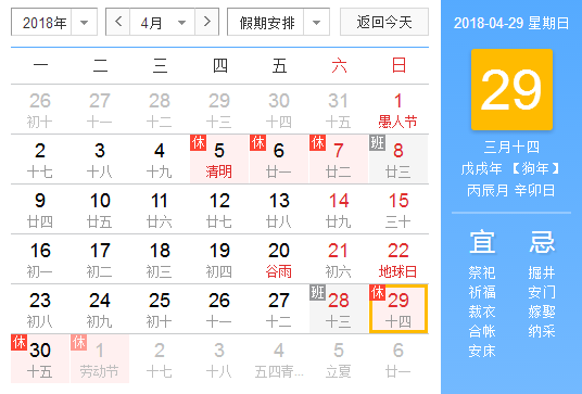 2018年五一放假安排時(shí)間表最新國務(wù)院官方發(fā)布: 4月29日(星期天)至5月1日(勞動(dòng)節(jié),星期二)放假調(diào)休,共3天。 友情提示:4月28日(星期六)上班。