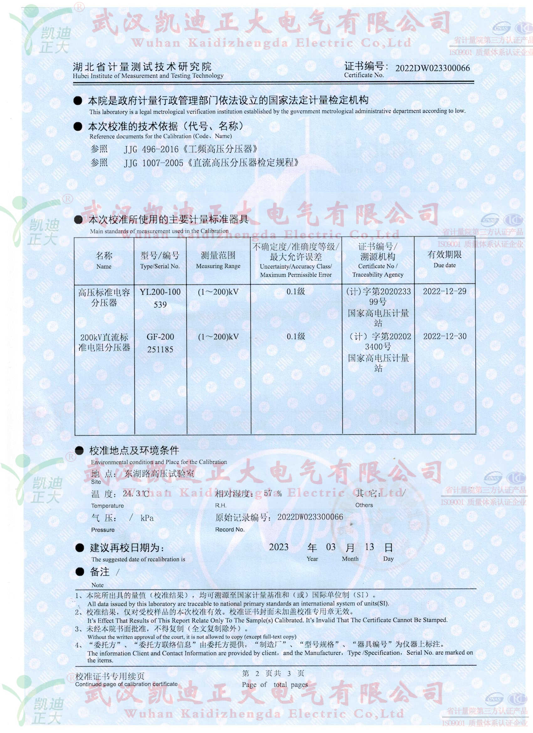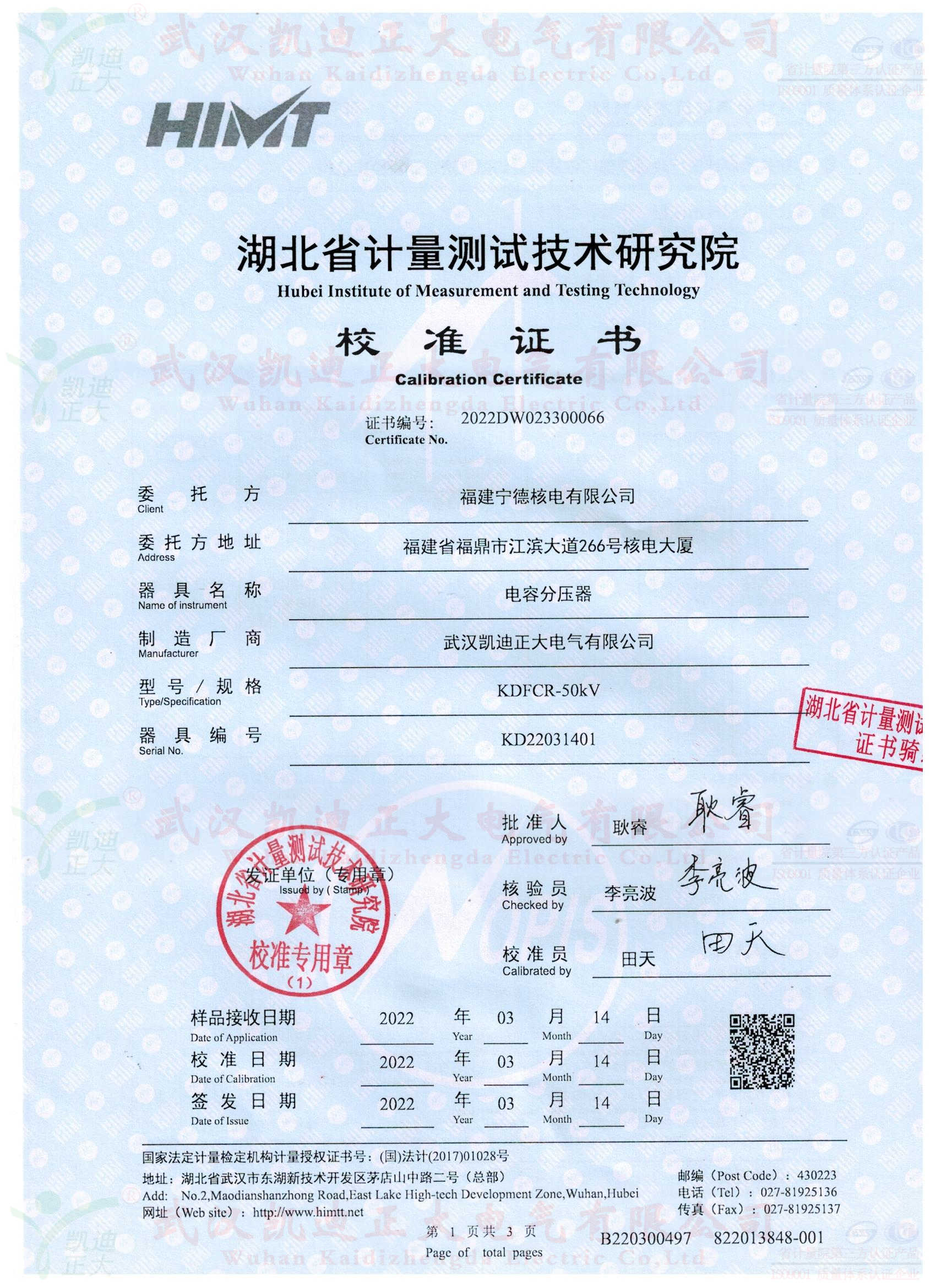 我司自成立以來多次獲得中廣核核電訂單,這次是福建寧德核電站采購KDFCR-50kV電容分壓器、KDQX-50kV保護(hù)球隙、50kV高壓試驗(yàn)用電纜等設(shè)備一批。應(yīng)要求供應(yīng)設(shè)備需要獲得湖北省計(jì)量測試研究院的檢定合格證書。
