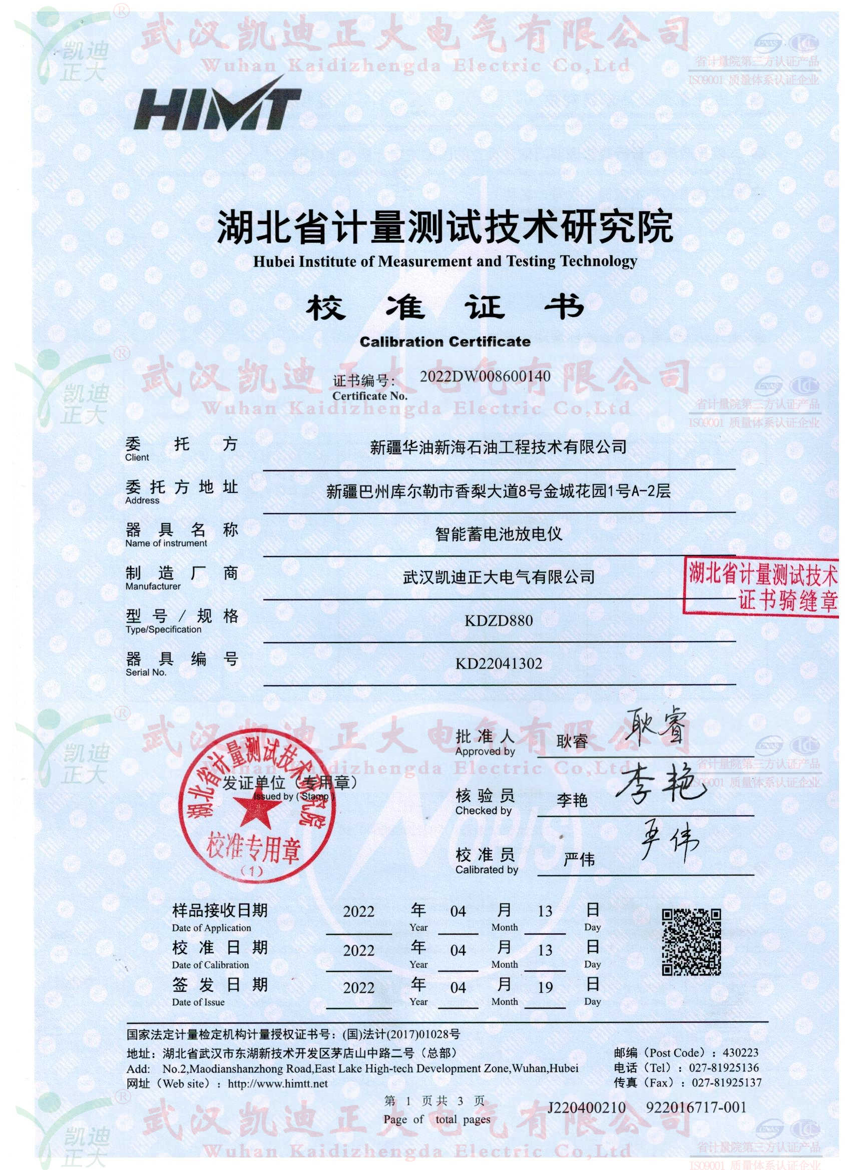 今年3月份,新疆華油工程部劉工致電我司。吐槽之前買的一批揚州某公司設備,使用不是很理想。這次選擇我們的KDZD818智能蓄電池內阻測試儀、KDZD882智能蓄電池放電監測儀等設備。話說“一朝被蛇咬十年怕井繩”,這次購買設備還是對比武漢幾家企業后綜合售后服務、品牌力、設備性能對比選擇我司,簽署技術協議并要求獲得湖北省計量測試技術研究院檢定報告,對于這些常規要求,我司幾乎有實力、有信心能夠獲得計量證書。
