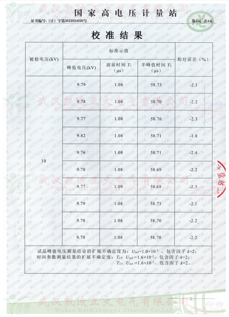 繼大連產品質量檢驗研究院采購低壓開關柜檢測設備KD7742智能耐壓絕緣測試儀獲大連計量檢驗檢測研究院有限公報告,宿遷產品質量技術研究院采購KDLJ-30雷電沖擊電壓發生裝置獲得國家高電壓計量站證書,這次成都計量院采購KDLJ-30雷電沖擊電壓發生裝置獲得國家高電壓計量站(武高所)校準證書。