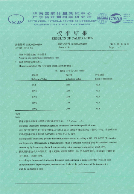 恒速器(恒轉速源)獲廣東計量科學研究院校準證書