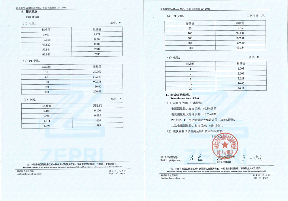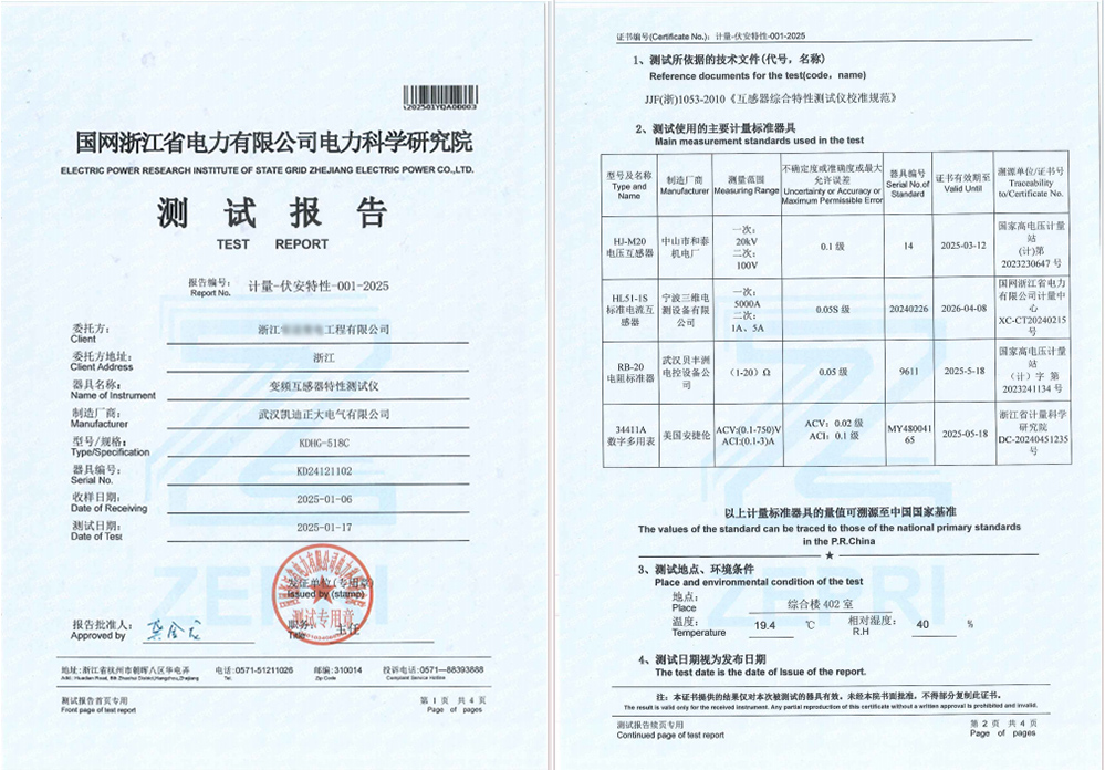 校準圍繞對儀器的變比精度、角差控制、伏安特性曲線擬合度等核心指標進行了多場景模擬測試。KDHG-518C變頻互感器特性測試儀具有操作簡便、功能全面、測試精準等特點,廣泛應用于各類CT(電流互感器)和PT(電壓互感器)的性能測試。此次通過國網(wǎng)浙江省電力有限公司電力科學研究院的校準,充分證明了KDHG-518C在技術指標、測試精度和穩(wěn)定性等方面的可靠表現(xiàn)。