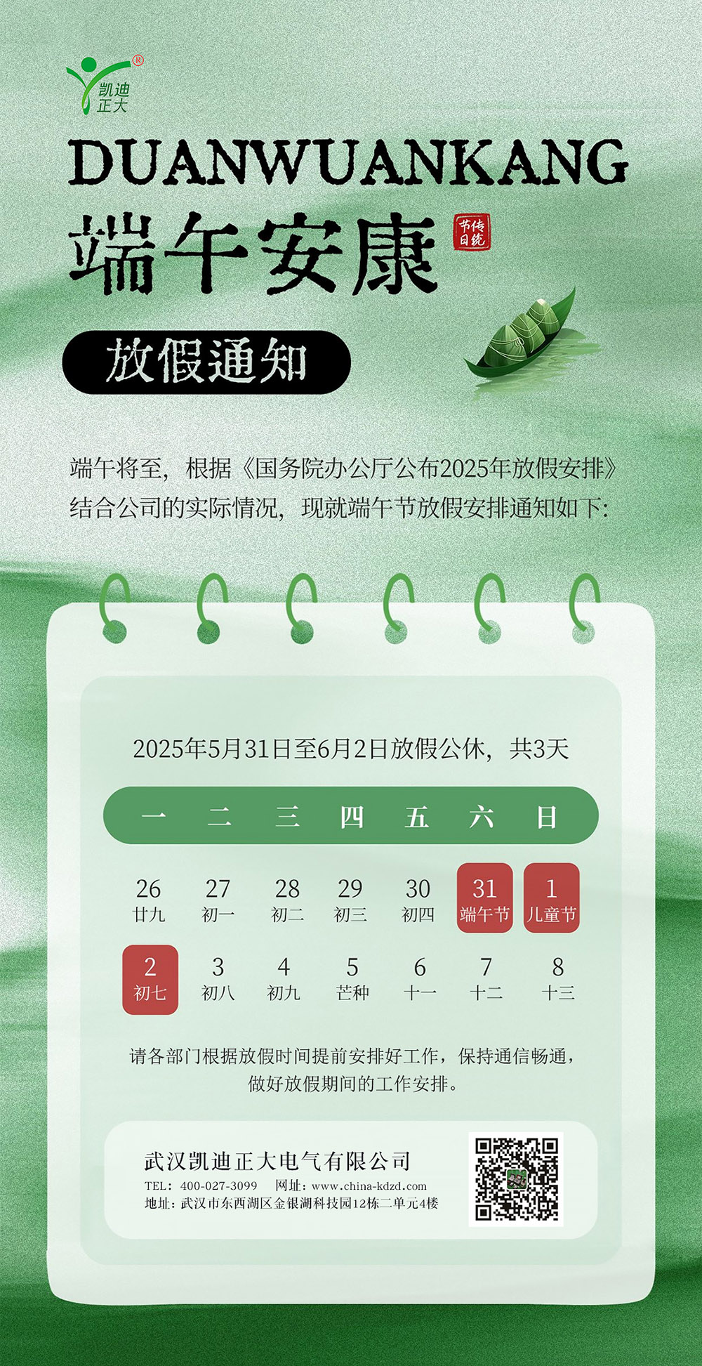 粽葉飄香時(shí),龍舟競(jìng)渡日,值此端午節(jié)來(lái)臨之際,根據(jù)國(guó)家法定假日安排及公司實(shí)際情況,現(xiàn)將武漢凱迪正大電氣端午節(jié)放假安排及相關(guān)工作要求通知如下: