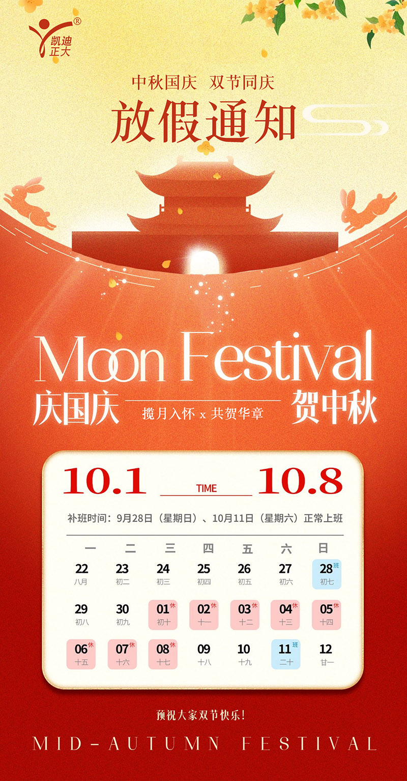 凱迪正大電氣2025年國慶中秋放假通知: 根據(jù)國家法定節(jié)假日安排,結合公司實際情況,現(xiàn)將2025年國慶節(jié)、中秋節(jié)放假事宜通知如下: